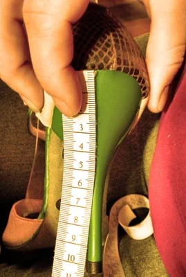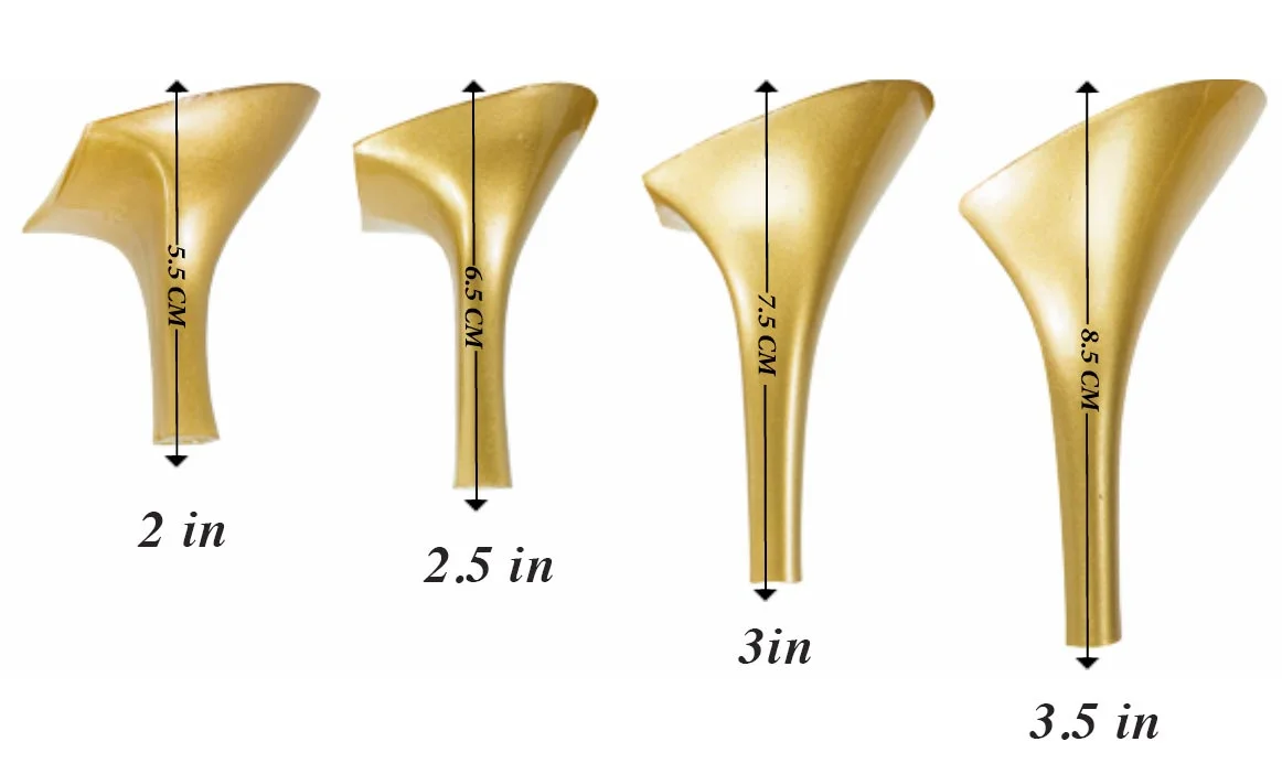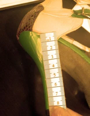 Other brands measure the heel from the highest point to the heel tap. Measuring the heel in that way we would find that our highest heel would be 4 in equal to 10.5 cm instead of 3.5 in.